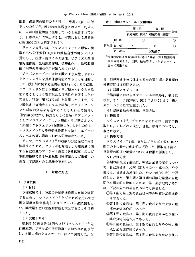 ジャパンモード社は、ラクトフェリン、リン酸化オリゴ糖カルシウムの両者を合わせて口腔に留めることを可能にした「マウスメイト錠剤」を開発、商品化致しました。錠剤に加工したことにより約15分口腔に留めることが可能になりました。