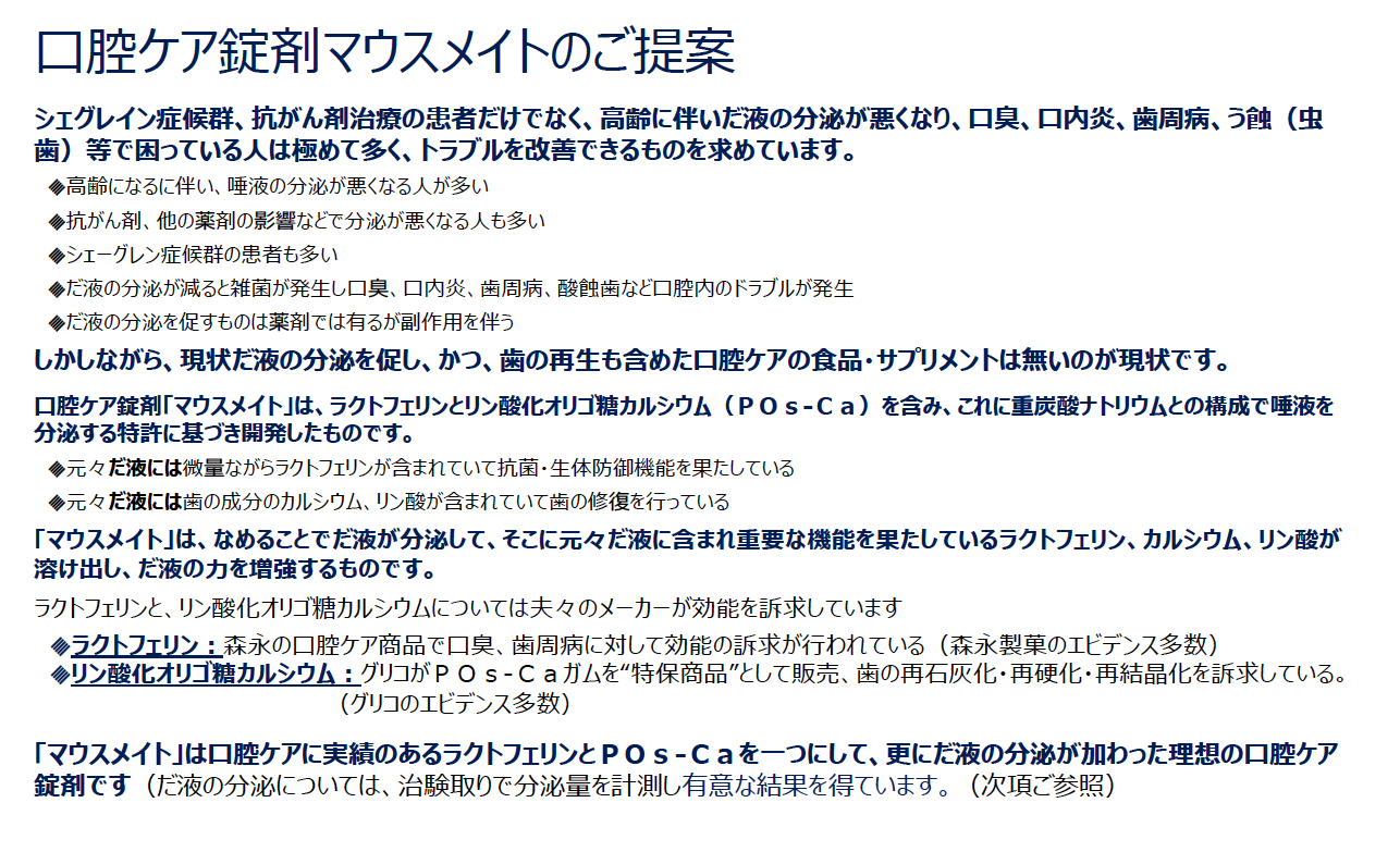 更に特許として訴求の唾液の分泌が認められ、口腔に留めることと唾液の分泌により、大きく口腔内環境を改善できる画期的な食品での口腔ケア錠剤の商品化と言えます。