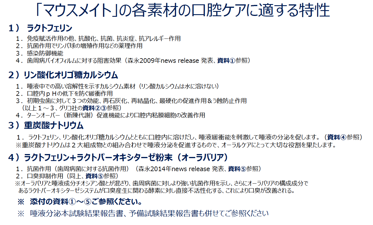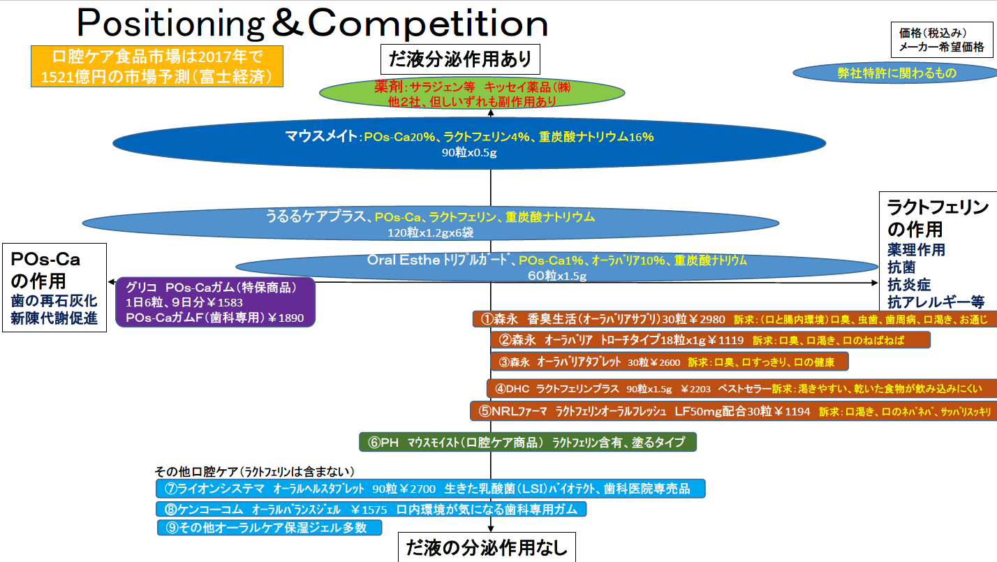 上記、効果についての正式な治験結果が得られれば、マウスメイトは唾液が湧く以外に大きく5点が訴求できることになります!