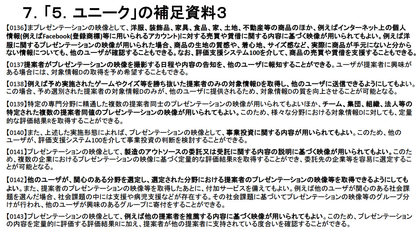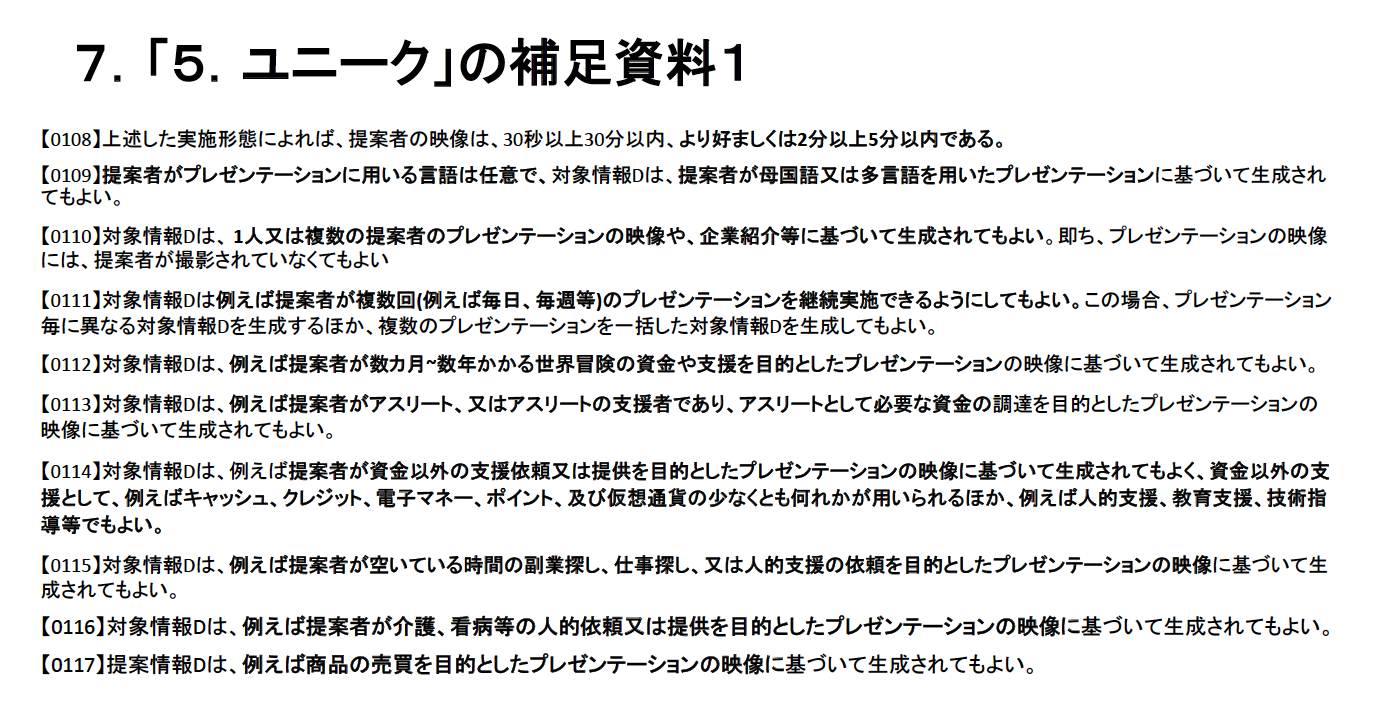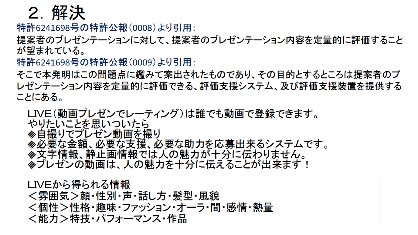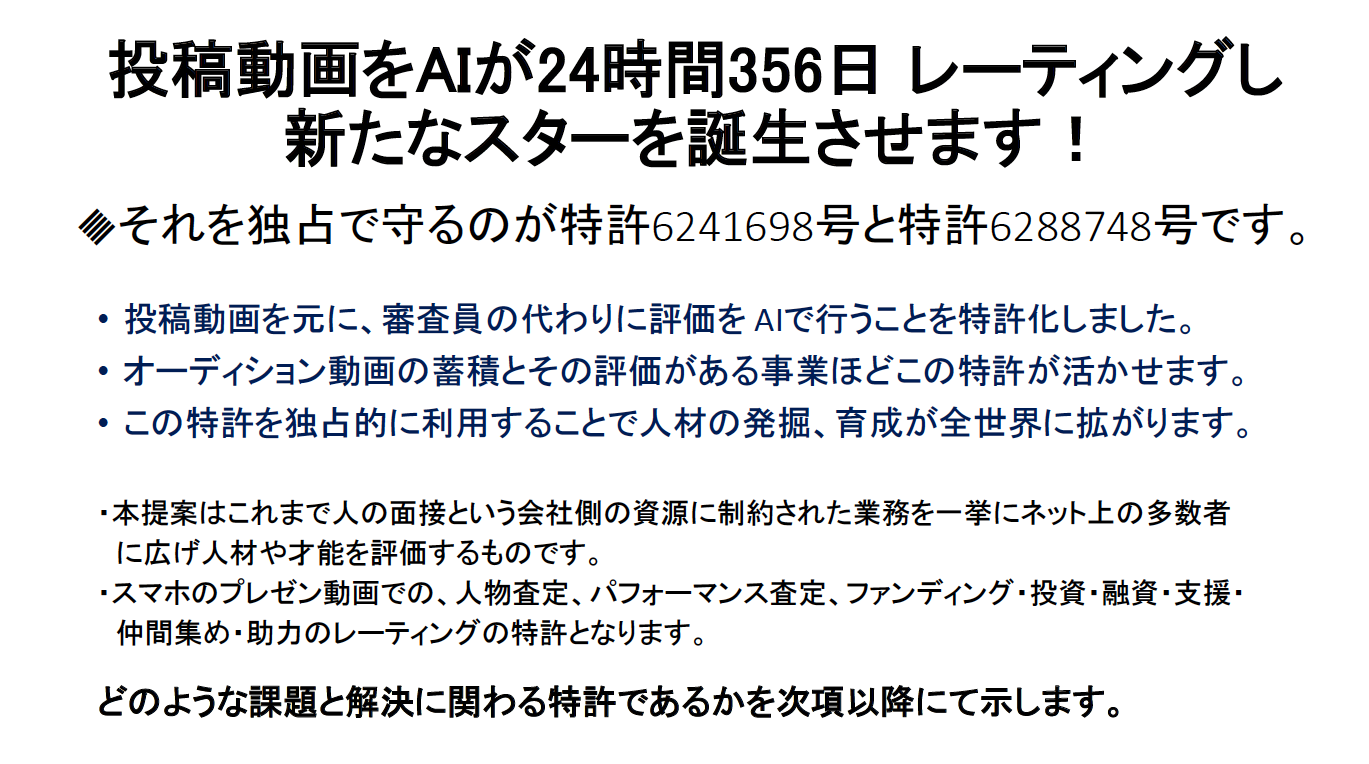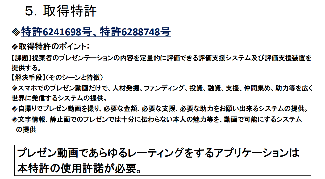 スマホのプレゼン動画での、面接査定、ファンディング・投資・融資・支援・仲間集め・助力等は全てこの特許に抵触致します。