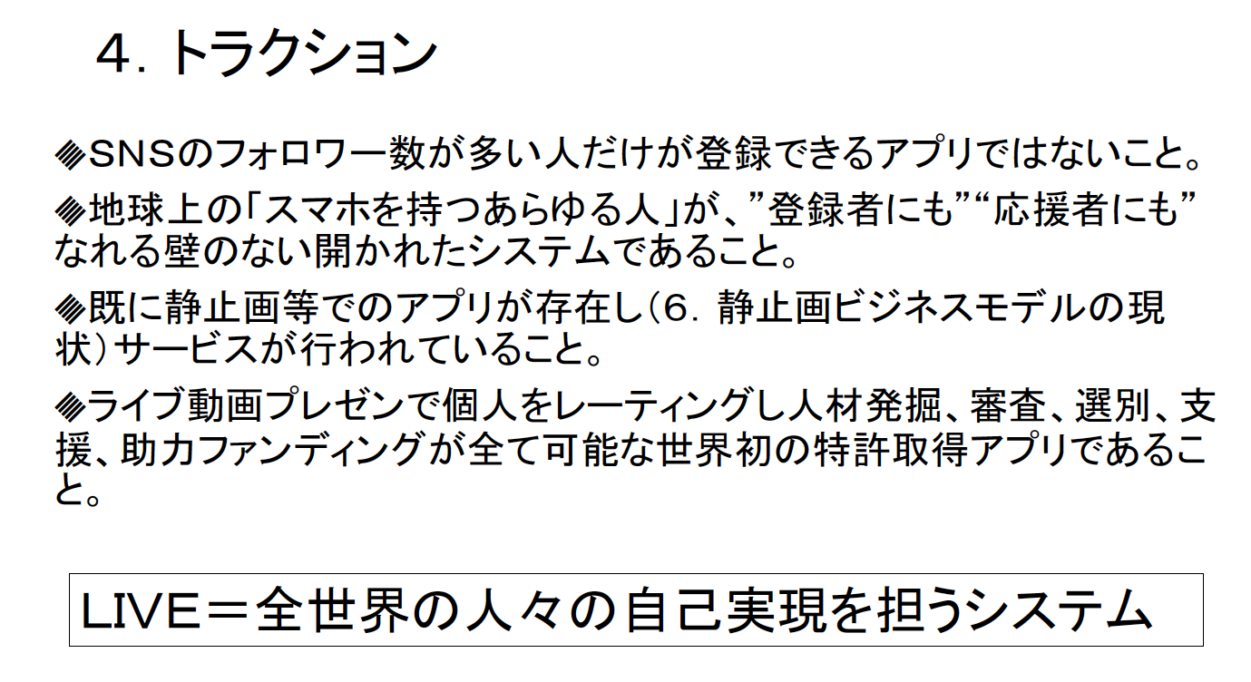 VALUやTimeBank、Polca等の個人を支援するアプリが続々と出て来ていますが、LIVEは「LIVE動画プレゼンで個人をレーティングしファンディングや投資・融資・支援・助力・仲間集めを進める」世界初の特許取得システムです。